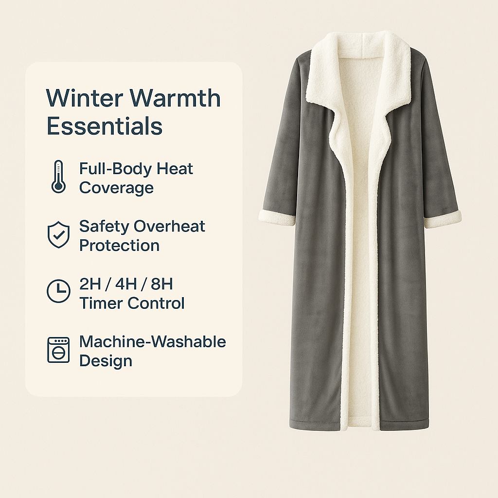 Cold mornings, late-night lounging, gaming sessions, study nights — no matter where you are, the Thermal Robe delivers rapid, even heat that keeps your whole body warm and relaxed